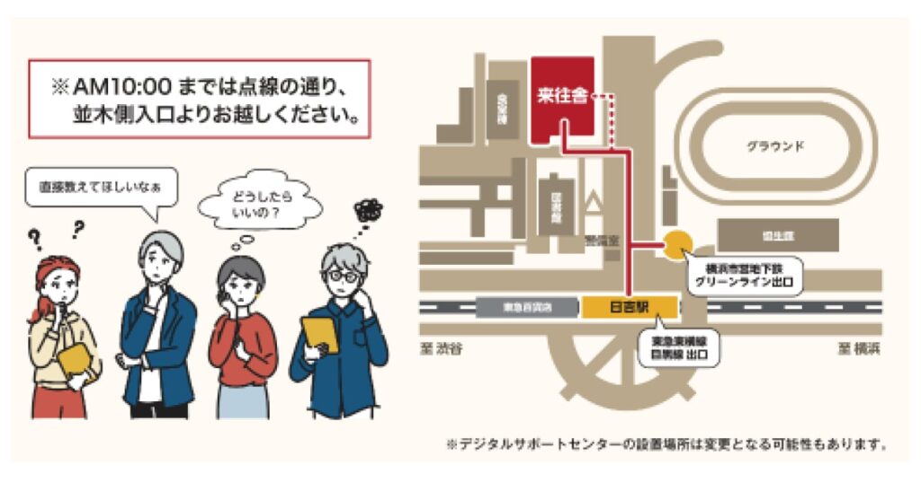 「デジタルサポートセンター」について 2025年10月7日 大会当日は、会場内に「デジタルサポートセンター」を開設します(来往舎にて) 「e大会券のお求め方法」「紙大会券の登録方法」「記念品の引換方法」「福引抽選のエントリー方法」など、わからないことがございましたら、クレジットカードをお持ちの上「来往舎」にお越しください。スタッフが対応いたします。