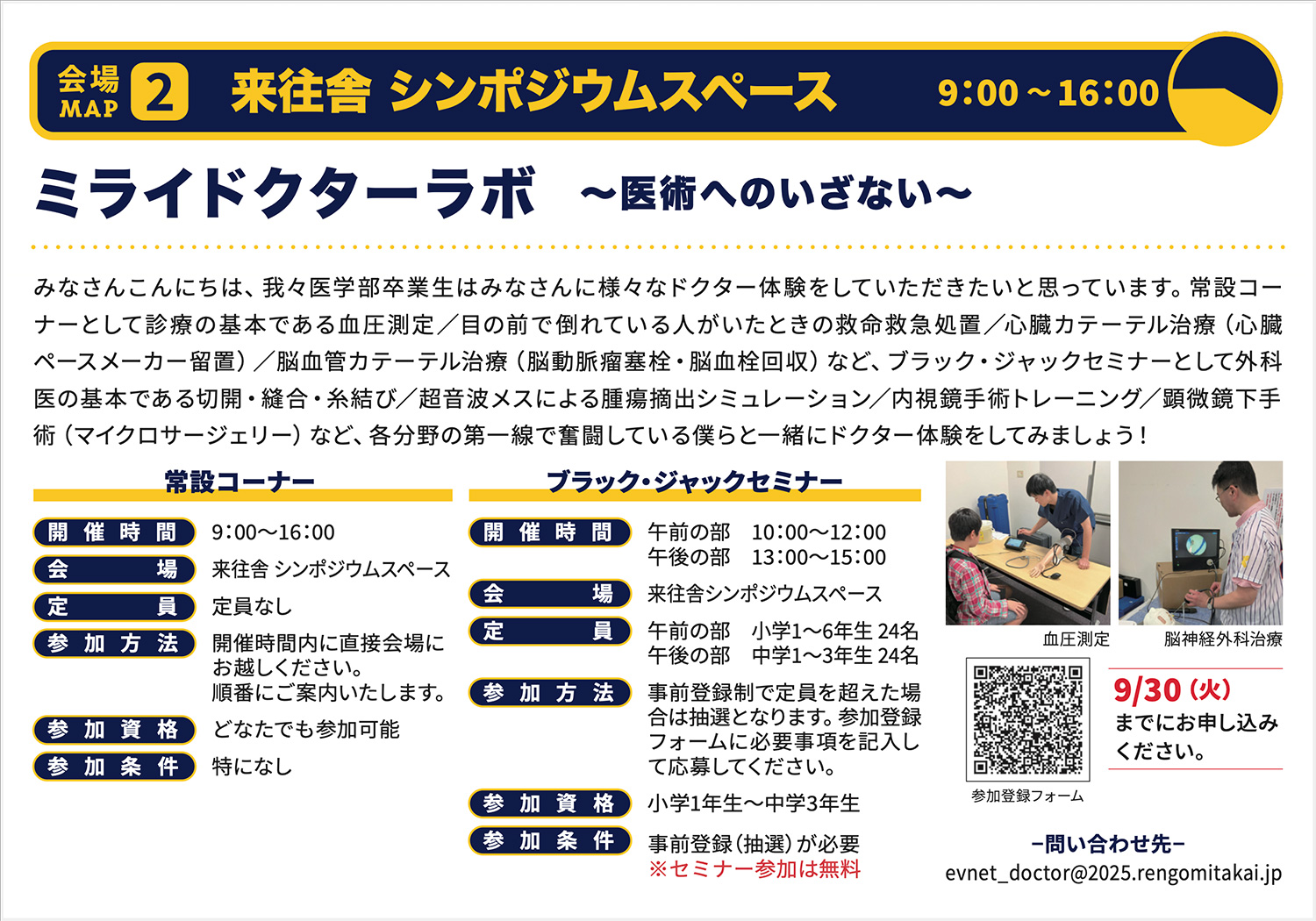 ※下記「ミライドクターラボ」イベント情報にある「Googleフォーム」からのお申込みとなります。事前登録制で定員を超えた場合は抽選となります。参加登録フォームに必要事項を記入して応募してください。9/30(火)お申込締め切り