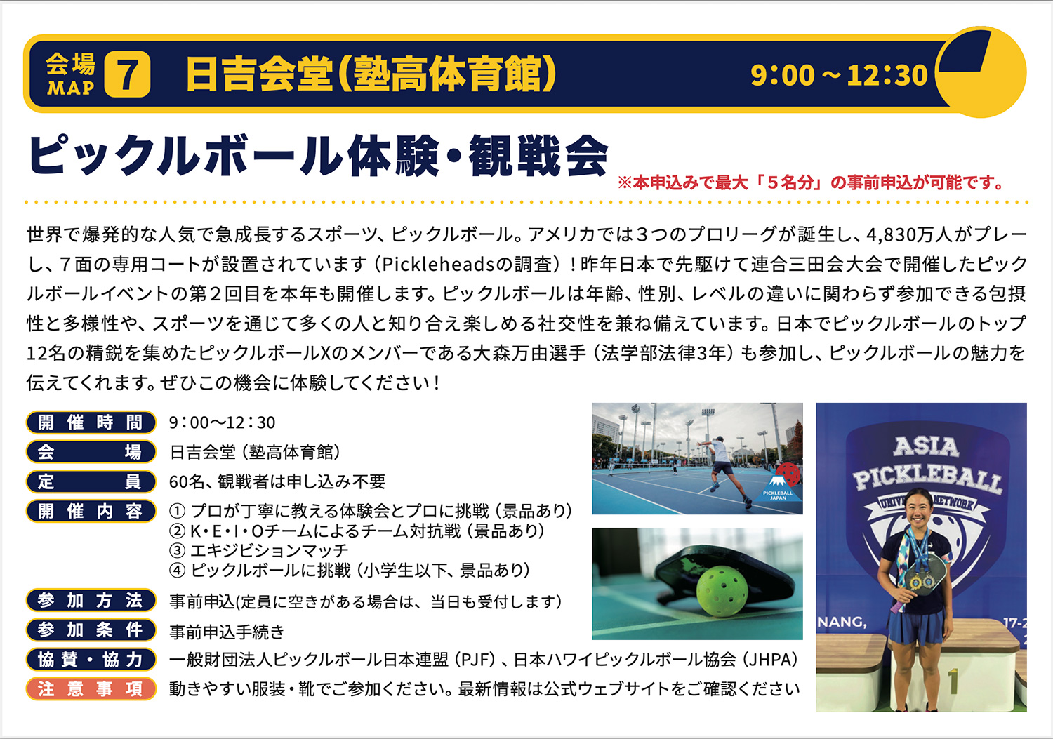 ★対象イベント:きかくのがっこう/はじめてでも大丈夫!ラクロス体験会/ミライドクターラボ内 「ブラックジャック・セミナー」※/ピックルボール体験・観戦会/陸上競技体験/チアリーディング(キッズ体験チア教室)/コピックであなたのエガオを描きます! (午前枠/2名ペアのみ、午後枠/先着順で受け付け)