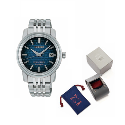 生産スタートから110年を超える「キングセイコー」は、亀戸で作り始められました。長寿や吉兆のモチーフである「亀」の甲羅柄を文字盤につけたこの時計に、持ち運び用に亀甲文様でおつくりした2025連合三田会大会オリジナル巾着をおつけし、ボックスクッションはオリジナル「ブルーレッドアンドブルークッション」を、裏面には今回のテーマ「集え三色旗の下に」を記載いたした連合三田会スペシャルパッケージでございます。
