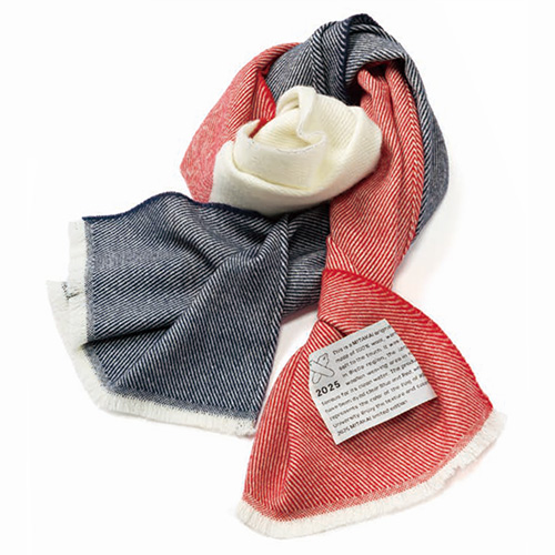 綺麗な水と美しい自然に恵まれ、世界有数の毛織物産業の中心地として知られるイタリアのビエラ地方で染められ、織られたウールマフラー。紺と赤の美しい発色にタグのさり気ないペンマークがおしゃれな2025年連合三田会スペシャルデザイン。ビエラ地方ならではのしっとりと暖かい肌触りが感じられる1枚です。