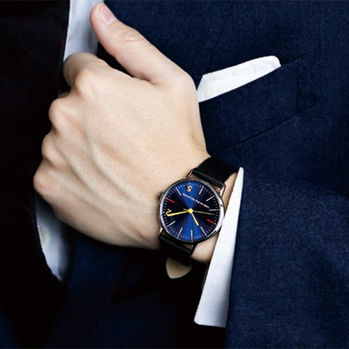 全体を三色旗カラーをモチーフに構成し、時針分針に加えて2025年を記念して2時と5時にはペンマークカラーを差し色にすることで、上品かつセンスの良い腕時計となっています。さらに、竜頭にはペンマークモチーフが施されており、まさにこのタイミングでしか手に入らないオリジナルウォッチです!