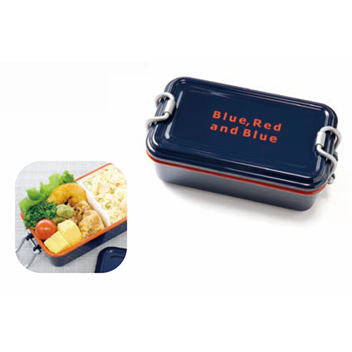 行楽や通勤通学にも重宝するお弁当箱のご紹介。身が深く、たっぷりおかずが入ります。蓋も留具でしっかりホールド。「Blue,Red and Blue」の文字が最高にcool。ボディの青・縁取りと文字の赤で三色を表現してます。