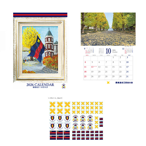慶應義塾の行事を掲載し、全体育会の早慶戦日程シールにして添付した全塾員必携の一品。また表紙は今年の大会のテーマ「集え三色旗のもとに」をモチーフに書き下ろした絵で記念品のハンカチの原画にもなっております。